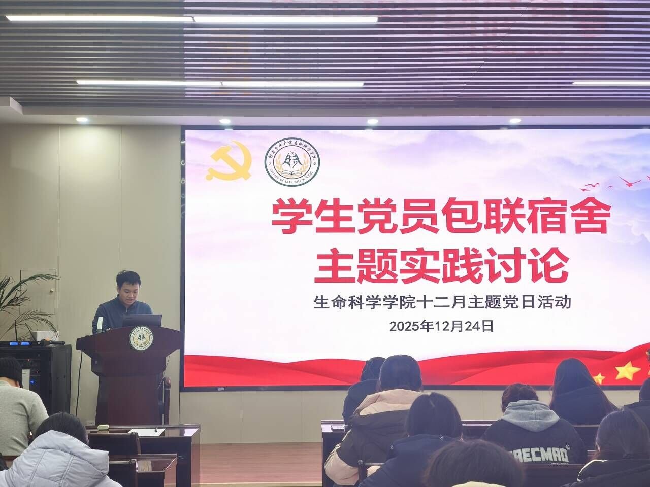 各学生党支部于12月24日中午开展学生党员包联宿舍主题实践讨论活动,各学生党支部书记主持,支部全体学生党员参加。