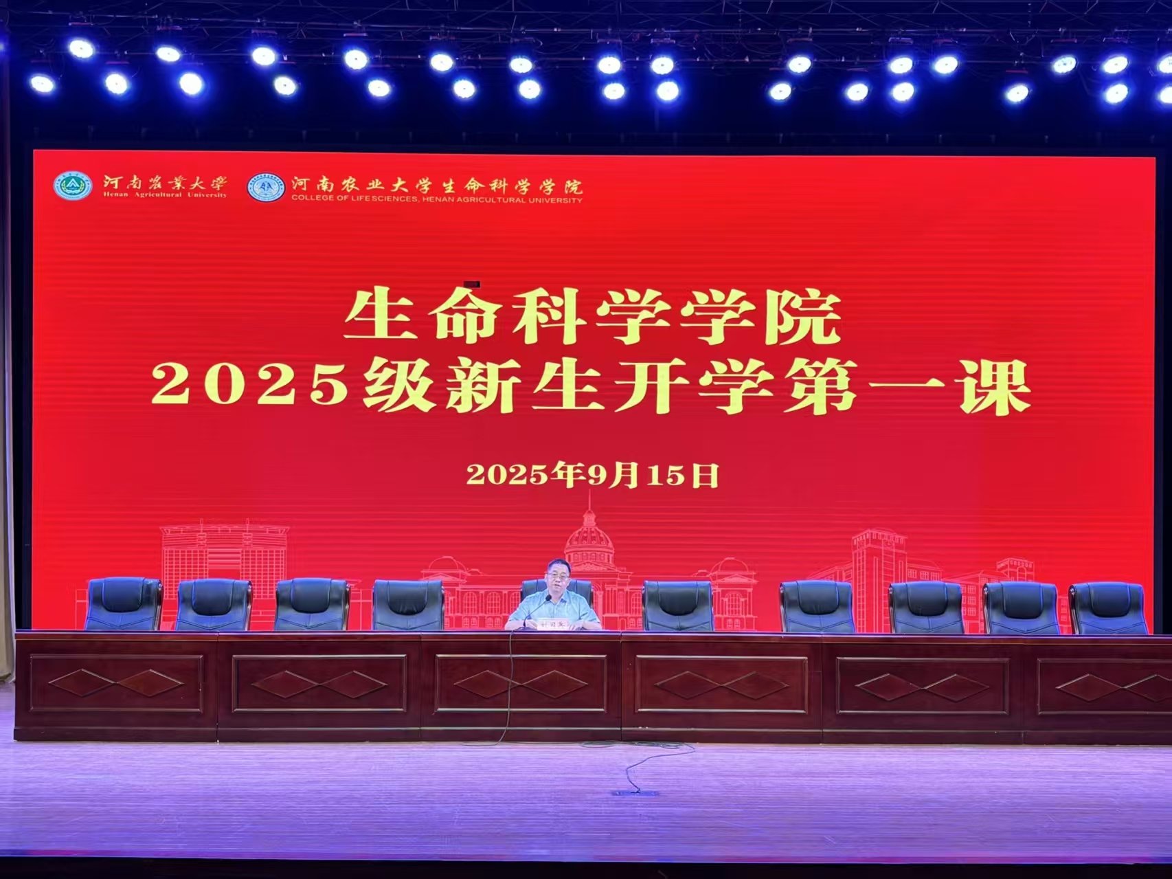 2025级本科新生开学典礼暨“开学第一课”在文化路校区大礼堂隆重举行。院党委书记刘国兵、院长张会勇、院党委副书记张世昌、副院长赵华新、植物学系主任袁志良、动物学系主任许君、微生物学系主任刘新育、生物化学与分子生物学系主任王潇然、党政办公室主任郭朋、团委书记刘展出席典礼。团委副书记、2025级辅导员张琨,各新生班主任、助班助教以及全体2025级新生参加。典礼由张世昌主持。