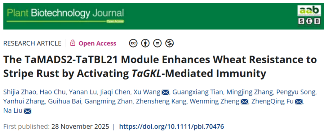 刘娜教授团队在《Plant Biotechnology Journal》上发表了题为“The TaMADS2-TaTBL21 Module Enhances Wheat Resistance to Stripe Rust by Activating TaGKL- Mediated Immunity”的研究论文。该研究首次揭示了TaMADS2-TaTBL21-TaGKL功能模块形成的免疫调控通路。该通路通过协同促进水杨酸(SA)与甘油-3-磷酸(G3P)等核心防御代谢物的积累,从而系统性增强小麦对条锈病的抗性。该发现不仅解析了小麦抗条锈病的新机制,同时为作物遗传改良提供了优异基因资源与分子靶点。