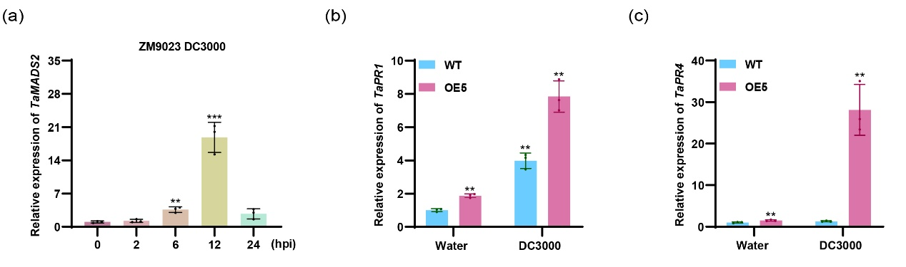 在普通小麦中,TaMADS2的表达受BTH与DC3000显著诱导(图3a, 4a)。过表达TaMADS2能够增强小麦防御反应:在BTH处理下,TaPR1、TaPR4和TaWCI2等防御基因表达显著上调(图3b-d);在DC3000侵染后,TaPR1与TaPR4的表达水平亦明显升高(图4b-c)。上述结果表明,TaMADS2可能通过调控系统获得性抗性(SAR)通路参与免疫应答。
