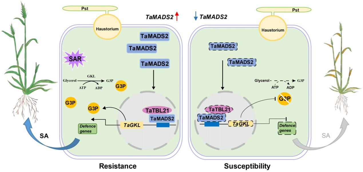 小麦作为全球最重要的粮食作物之一,其安全生产长期受到条锈病(Puccinia striiformis f. sp. tritici, Pst)的严重威胁。该病害每年导致全球小麦减产超过550万吨,仅在中国年均发生面积就达250万公顷,对粮食安全构成持续挑战。发掘抗病基因并阐明其作用机制,已成为培育持久抗病品种的关键基础。MADS-box转录因子在植物发育与非胁迫应答中具有重要调控功能,然而其在小麦与条锈菌互作过程中的作用机制仍不清楚。