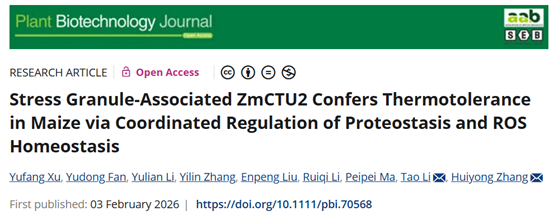 张会勇团队在Plant Biotechnology Journal (中科院一区,IF 10.5)在线发表了题为“Stress Granule-associated ZmCTU2 Confers Thermotolerance in Maize via Coordinated Regulation of Proteostasis and ROS Homeostasis”的研究论文。该研究发现tRNA硫醇化蛋白ZmCTU2作为应激颗粒支架蛋白协同调控蛋白质稳态与抗氧化通路,过表达ZmCTU2可显著增强玉米幼苗和成株期的耐热性,提高热胁迫下的存活率与田间产量,为玉米耐热遗传改良提供了重要基因资源。
